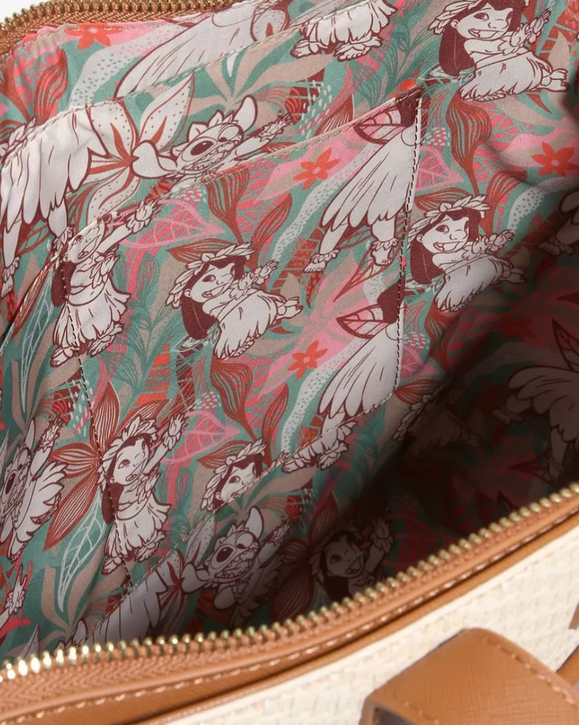 Pack up for a beach day with this Lilo & Stitch tote bag! Textured like woven raffia on the body of the bag, the front pocket includes Stitch hula dancing with an applique grass skirt and embroidered flowers. With more grass details on the sides and a design of Nani and Lilo dancing on the back pocket, this bag includes top handles, backpack straps, and a crossbody strap to wear multiple ways. Don't forget the matching wallet sold separately!