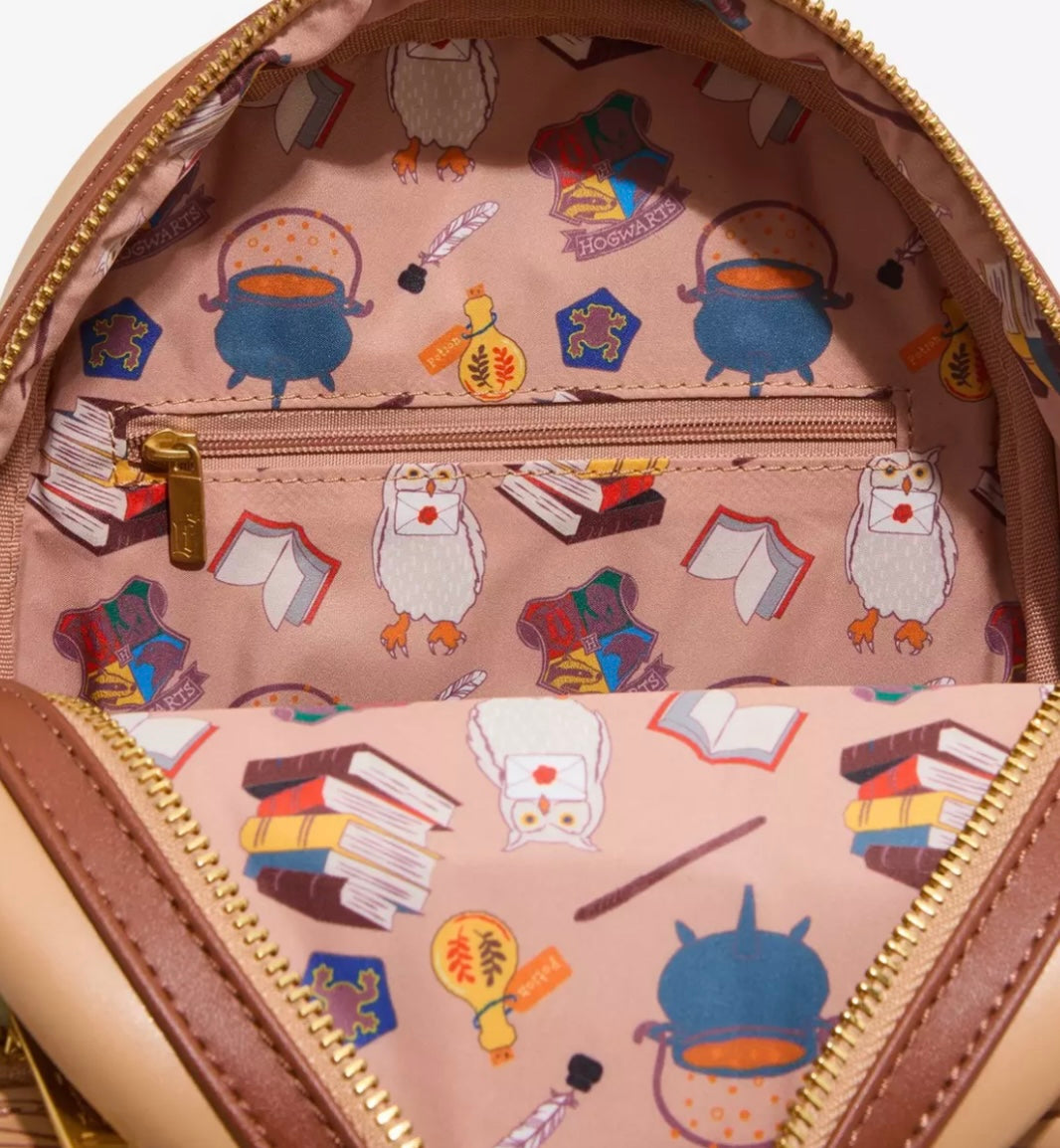 This is one purchase you can't miss in Diagon Alley! Accented with applique and embossed details, this Harry Potter mini backpack features books, potions, and Hedwig above a faux wood front pocket.