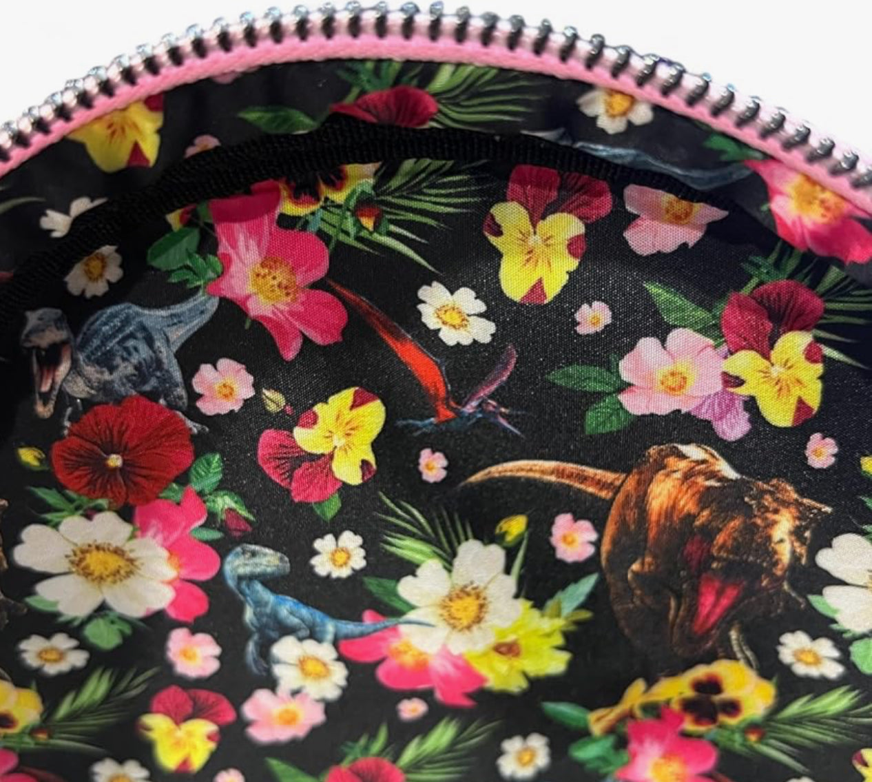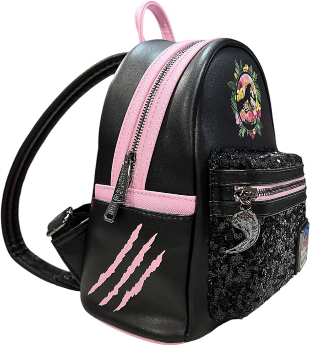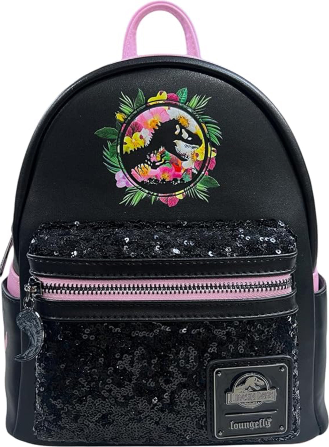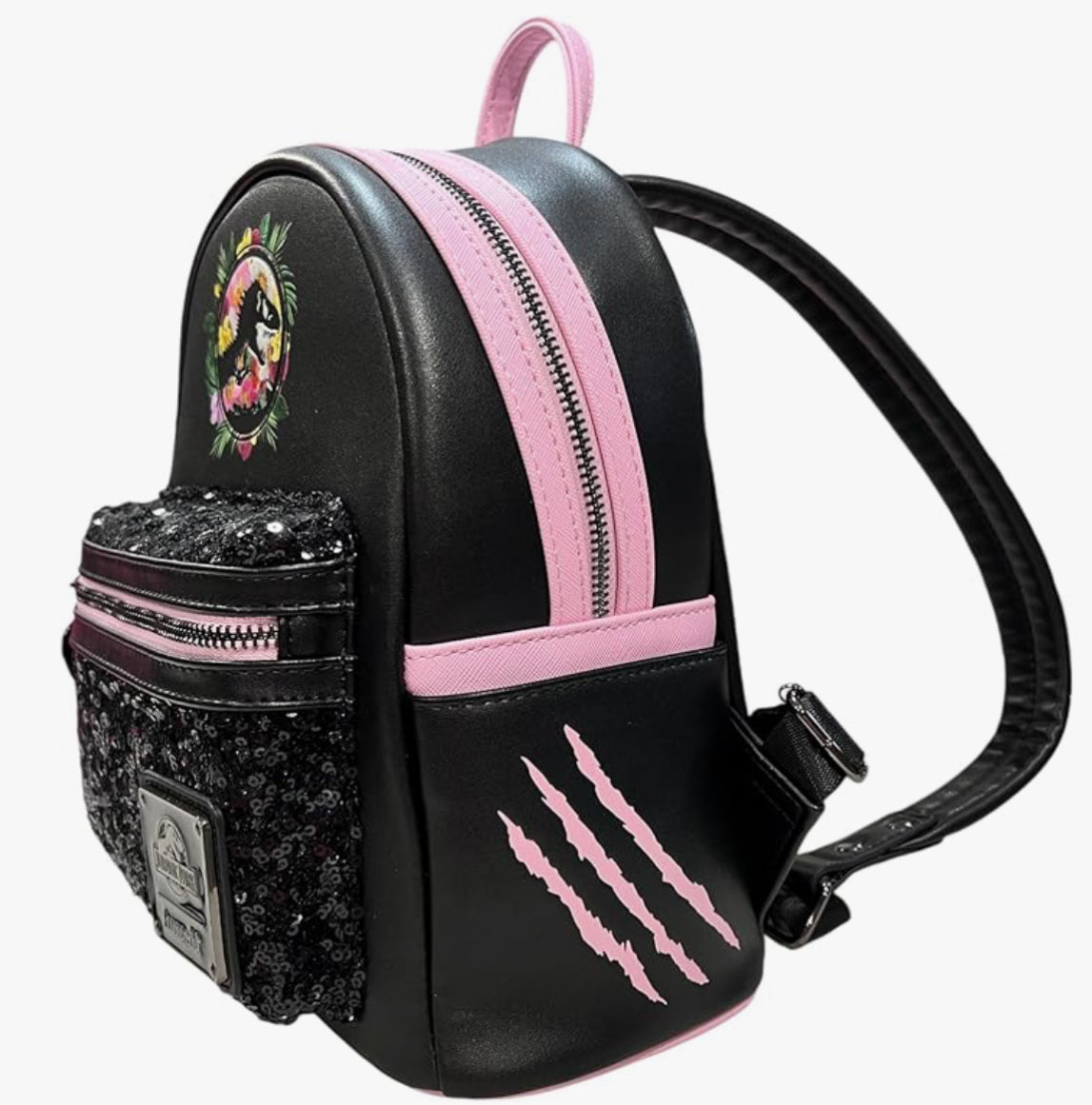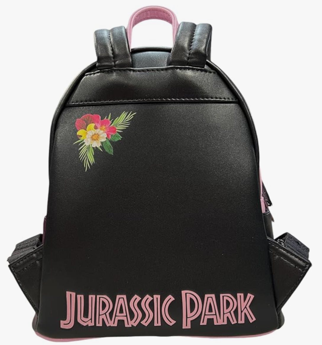 Jurassic Park Sequin Pink Floral Mini Backpack. Perfect for any fan, this unique backpack features black sequin details, a debossed Jurassic Park logo, and a beautiful floral design.